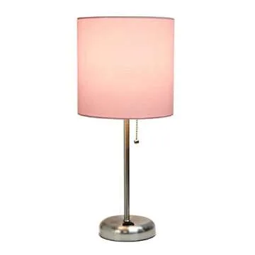 Simple Designs LT2024-LPK Brushed Steel Stick Table Desk Lamp with Charging Outlet and Drum Fabric Shade, Light Pink
