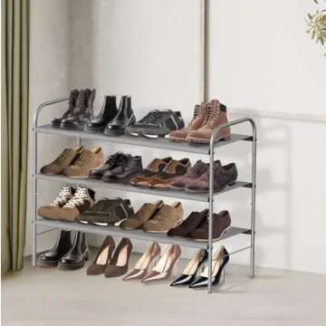Show moreWelcome to a clutter-free lifestyle with the Simple Houseware 3-Tier Shoe Rack Storage Organizer. Designed with love and efficiency, this shoe rack is the ultimate solution for organizing your footwear while effortlessly enhancing your décor. Made from sturdy metal construction with a chic brushed silver finish, and paired with durable 600 D polyester fabric, this stylish organizer is not only functional but also complements various themes, including a trendy steampunk or industrial aesthetic. With its ability to hold between 9-16 pairs of shoes, your entryway, closet, or laundry room will look neat and tidy in no time.