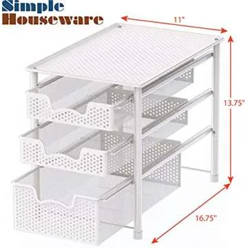 Show moreTransform your cluttered spaces into elegant, organized havens with the Simple Houseware 3 Tier White Alloy Steel Sliding Basket Organizer Drawer Cabinet. Expertly crafted by a renowned manufacturer known for quality home products, this versatile storage solution is ideal for any room in your home—from the bathroom to the kitchen or even craft corners. Its stylish and modern white metal construction ensures that it not only serves a purpose but also adds an element of sophistication to your decor. Measuring at 16.75''L x 11''W x 13.75''H, this organizer fits seamlessly under sinks and is perfect for maximizing space where you need it most.