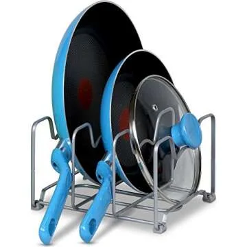 Show moreIntroducing the Simple Houseware Kitchen Houseware Organizer Pantry Rack, the ultimate solution for creating a clutter-free kitchen! This versatile organizer is designed specifically for pots, lids, cutting boards, and various bakeware, making it an essential addition to your culinary space. Crafted from durable steel with a sleek silver finish, it effortlessly combines functionality with modern style. Measuring 9 inches long, 7.8 inches wide, and 5 inches high, it fits seamlessly into any cabinet or countertop while also providing 2.56 inches of width per compartment, allowing for efficient organization of your cookware and bakeware.