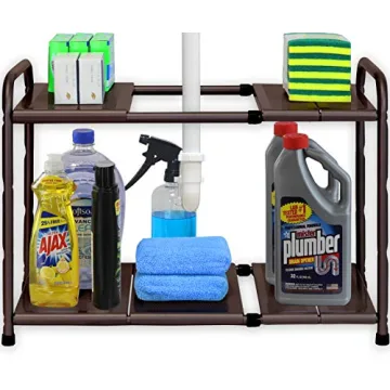 Show moreIntroducing the Simple Houseware Under Sink 2 Tier Expandable Heavy Duty Metal Shelf Organizer Rack in a stunning bronze finish, your go-to solution for transforming cluttered spaces into organized havens. Whether you’re facing a chaotic under-sink cabinet in your bathroom or kitchen, this shelf organizer is expertly crafted to expand from 15 to 25 inches, adapting seamlessly to your unique space requirements. Its four adjustable height settings provide you with the flexibility needed to navigate around pipes and maximize storage potential, making it the perfect ally in your fight against mess.