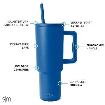 Show more Introducing the Simple Modern 40 oz Tumbler with Handle and Straw Lid, the ultimate hydration companion that combines style, functionality, and durability. Crafted from premium 18/8 stainless steel, this tumbler is designed to withstand the rigors of an active lifestyle while keeping your beverages at the perfect temperature for hours on end. Whether you're heading to the gym, on a road trip, or just enjoying a sunny day at the park, this insulated reusable water bottle makes it easy to stay hydrated in style. Its sleek and tapered design not only fits comfortably in your hand but also slides effortlessly into your cupholder — no more spilling during sharp turns! Available in the stunning Twilight color, this tumbler subtly showcases your personality while offering unmatched practicality.