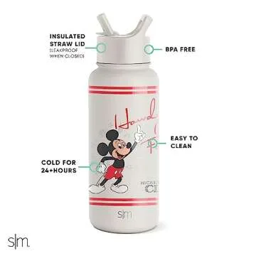 Show more Experience the magic of hydration with the Simple Modern Disney Mickey Mouse Water Bottle. This 32oz vacuum insulated stainless steel thermos is designed to keep your beverages at the perfect temperature for hours, whether you’re enjoying a hot cocoa or refreshing iced tea. Its vibrant "Mickey Howdy Folks" design captures the charm of Disney, making staying hydrated not only practical but also fun for fans of all ages. Plus, the included BPA-free straw lid is dishwasher safe on the top rack, ensuring easy cleanup and convenience for busy lifestyles.