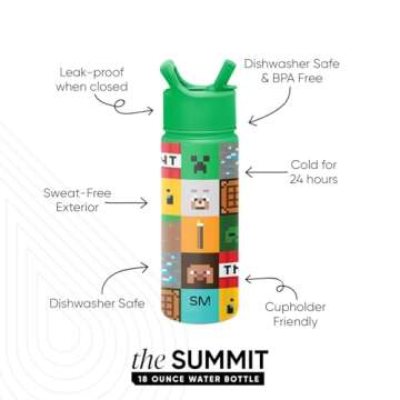 Show more Introducing the **Simple Modern Summit Water Bottle with Straw Lid**, a vibrant and playful tumbler that's perfect for kids aged 3 and up! This expertly designed 18oz stainless steel cup brings a splash of excitement with its unique **Minecraft Mashup** theme, capturing the essence of adventure that children adore. Crafted with **double wall insulation**, this bottle keeps drinks at the perfect temperature for hours, making it an ideal companion for school days, outings, or simply quenching thirst while gaming at home. It's not just about looks; the bottle is made without lead, BPA, or phthalates, ensuring safety and health for your little ones.