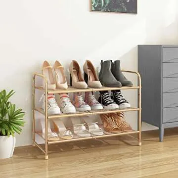 Show more Introducing the Simple Trending 3-Tier Stackable Shoe Rack, your ultimate solution for shoe organization that combines style with functionality! This stunning shoe shelf in a golden yellow finish offers a sophisticated touch while serving as the perfect storage solution for boots, sneakers, and heels alike. With a capacity to hold 9-12 pairs of shoes, this rack provides ample storage without compromising on aesthetics. Crafted with thickened metal tubes and a smooth power-coated finish, it promises incredible durability alongside a chic design that will blend seamlessly into any home decor.