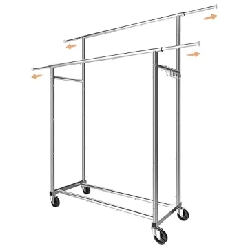 Simple Trending Double Rod Clothing Garment Rack, Rolling Clothes Organizer on Wheels for Hanging Clothes,with 4 hooks, Chrome
