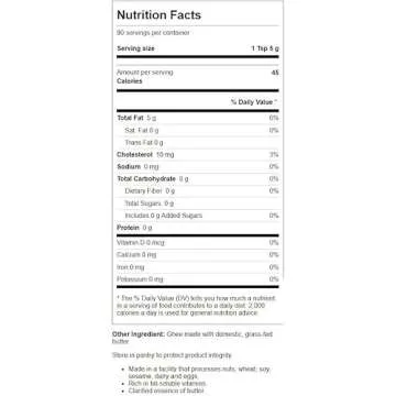 Show moreIntroducing Simply Ghee Domestic Grass-Fed Ghee, a premium clarified butter that elevates both your cooking experience and nutritional intake. Sourced from grass-fed cows, this exquisite 16 oz jar of ghee is not only rich in flavor but also a powerhouse of fat-soluble vitamins that support a balanced diet. With its high smoke point of 485 degrees Fahrenheit, it's the perfect cooking fat for all methods, whether you're sautéing, frying, or baking. Embrace the rich, nutty taste of ghee while enjoying the numerous health benefits it offers, making it a must-have in any kitchen.