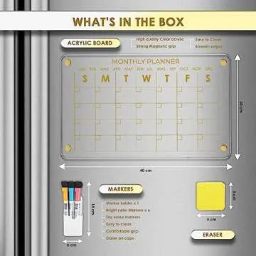 Show more Introducing the perfect solution for keeping your life organized while adding a touch of elegance to your kitchen: the Magnetic Dry Erase Board for Fridge. Crafted by a leading brand known for its durable home accessories, this 16 x 12 inch dry erase fridge calendar is specifically designed to offer functionality without compromising on style. The upgraded stronger magnets ensure that the calendar stays securely in place, eliminating any worries about it sliding down or scratching your refrigerator's surface.