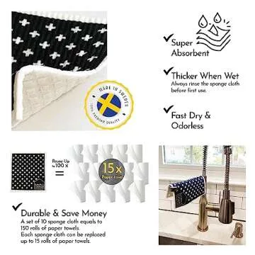 SIMPLYCASA 10 Pack Reusable Swedish Dishcloth, for Kitchen and Household Use Super Absorbency, Made in Sweden, Cellulose Sponge Dish Cloths, Paper Towel Replacement, Plastic-Free Packaging