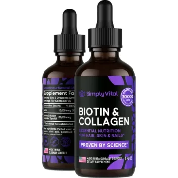 Show more Transform your beauty routine with Simply Vital's Liquid Collagen & Biotin Vitamins, the ultimate solution for radiant hair, youthful skin, and strong nails. This carefully crafted blend of 10,000 mcg biotin and collagen peptides delivers maximum absorption to help you achieve your beauty goals. With each drop, you are nourishing your body from within, fortifying your hair follicles, enhancing skin elasticity, and ensuring your nails stay robust and healthy. Experience the powerful effects of liquid supplements that set a new standard for beauty enhancement.