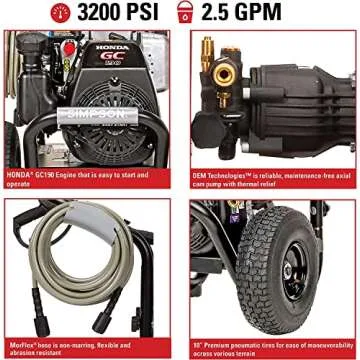 The Simpson MegaShot Pressure Washer delivers a powerful 3200 PSI at 2.5 GPM, making it suitable for various outdoor cleaning tasks.