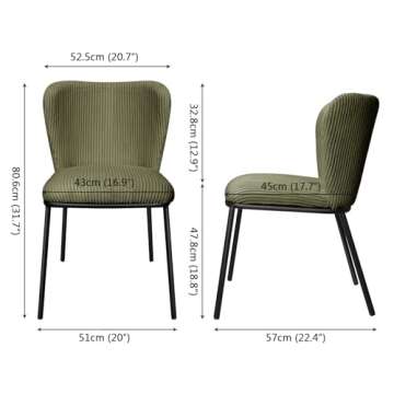 Show moreIntroducing the SIMTONAL Green Dining Room Chairs Set of 2—the perfect blend of style and functionality for your dining space. These charming armless chairs are meticulously crafted from premium corduroy fabric, radiating an elegant appearance. With a vibrant green hue, they can effortlessly elevate any room while providing a vibrant touch that complements various decor styles. Designed to fit seamlessly into your kitchen or dining area, these chairs become a stunning focal point, inviting friends and family to gather around your table.
