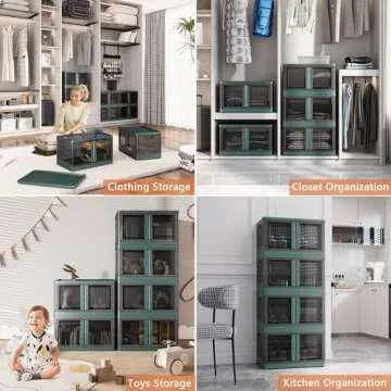 Sineda 8.4 Gallon Collapsible Storage Bins with Lids, 6 Pack - Stackable Storage Bins with Doors and Wheels, Plastic Storage Cabinet for Easy Storage and Organization, Green