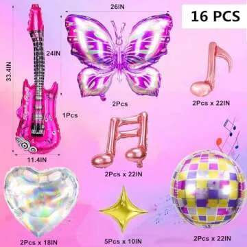 Show moreTransform your next celebration into a vibrant festival of music with our **Singer Balloons 16Pcs Set**. This delightful assortment features 16 unique foil balloons that capture the essence of music and fun, including 2 disco ball balloons, 2 butterfly balloons, 2 shimmering heart balloons, 1 playful guitar balloon, 4 whimsical music note balloons, and 5 charming star balloons. Crafted to inspire creativity, these balloons are perfect for any party theme, ensuring your important events will be filled with excitement and joy.