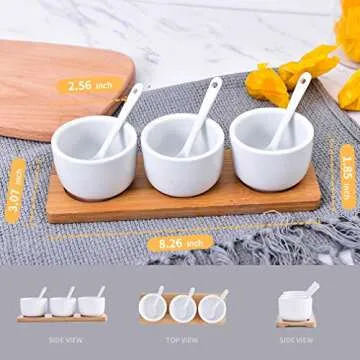 Show more Introducing the exquisite Mini Sauce Bowl Set, a delightful addition to any dining experience! This charming trio is designed to elevate your gatherings with its elegant European and American-inspired aesthetics. Each porcelain bowl, measuring 1.75 x 2.56 inches and holding up to 3 oz, is perfect for condiments, dips, or small snacks. The bowls come beautifully packaged in a gift box, making it a fantastic present for friends and family. The accompanying bamboo trays not only add a touch of sophistication but also provide a functional space for your sauces, ensuring that each bowl is easily accessible.