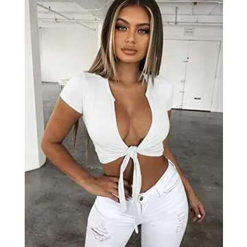 SINRGAN Women's Sexy Tie Up Crop Top Short Sleeve Deep V Neck Casual Basic T Shirt White