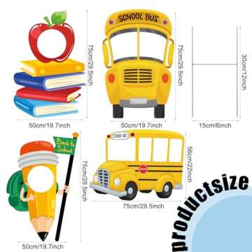 Show moreBring the excitement of back-to-school season to your yard with the Sintuff 4 Pcs School Bus Photo Frame Sign Photography Decorations. This enchanting garden decoration set includes four vibrant yard signs, each thoughtfully illustrated with cheerful school-themed graphics like a charming school bus and various educational symbols. Crafted with durable PVC board and equipped with sturdy metal stakes, this decoration combines fun and functionality, making it a perfect addition to any lawn or garden. Set up is a breeze, allowing you to transform your outdoor space into a festive celebration of learning in no time!