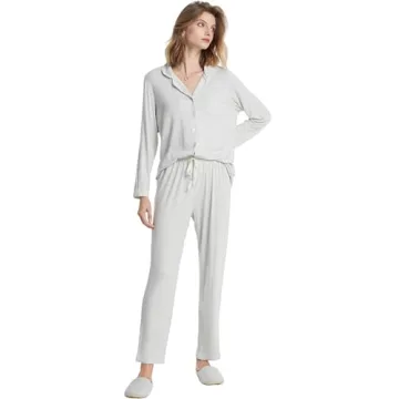 Show moreIntroducing the elegant SIORO Women's 2-Piece Pajama Set, your new favorite sleepwear, designed specifically for effortless lounging and comfort. Expertly crafted from high-quality modal fabric, this pajama set is both soft and breathable, making it ideal for year-round wear. With its chic contrast piping and tasteful notch collar, these pajamas seamlessly combine style with functionality. The full button-down front allows for easy wear, while the drawstring waist ensures a custom fit that adapts to your body, making sure you feel relaxed at all times. Whether you're enjoying a quiet evening at home or looking for a cozy outfit during recovery, this pajama set is made to impress.