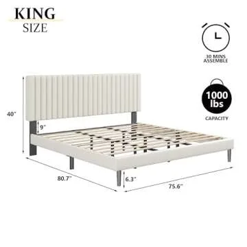 Sismplly King Size Bed Frame with Velvet Upholstered Headboard, Platform Bed with Strong Wood Slats, Mattress Foundation, Box Spring Optional, Easy Assembly, Beige