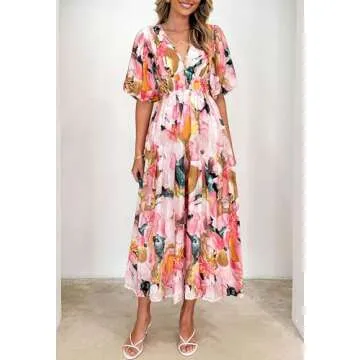 Sissyaki Women's Boho Floral Midi Dress Smocked Beach Flowy Dress Multi Pink Print M