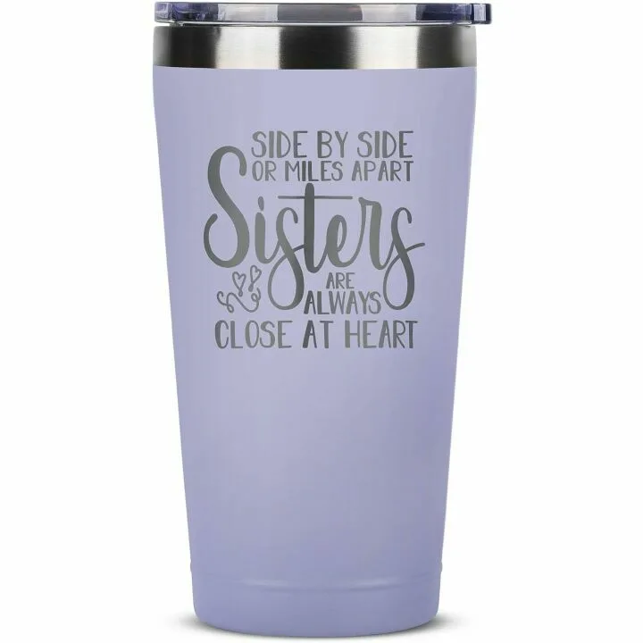 Show moreIntroducing the perfect way to show your sister just how much you care with the stunning 'Sister Gifts From Sisters' Tumbler. This charming and practical 16 oz lilac tumbler, branded with the phrase 'Sisters Are Always Close at Heart,' is an exceptional gift that combines thoughtful sentiment with everyday usability. Designed especially for the special women in your life, this tumbler is an ideal choice for best friends, little sisters, or big sisters alike. The beautiful lilac color adds a touch of elegance, and the high-quality construction ensures durability and longevity. Whether for a birthday, holiday, or just because, this tumbler is a heartfelt gesture that your sister will treasure.