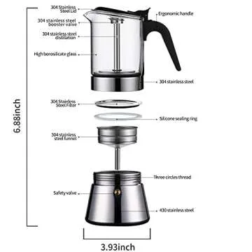 Show more Introducing the SIXAQUAE Moka Induction Stovetop Espresso Maker, the perfect blend of elegance and functionality in your coffee brewing routine. This exquisite Italian coffee maker features a newly upgraded pressure valve, enhancing the extraction process by providing a remarkable 33% more concentrated coffee than standard moka pots. Not only does it offer a superior brew, but its design ensures that every cup delivers a beautifully rich flavor with an additional 16% higher extraction efficiency. Made from premium 304 food-grade stainless steel and high borosilicate glass, this moka pot is not just a treat for the taste buds but also a feast for the eyes, allowing you to observe the brewing process and enjoy the mesmerizing sight of your coffee coming to life.