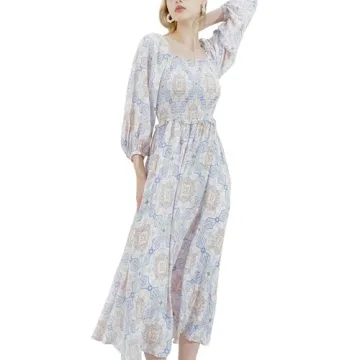 SIXDO Womens 2025 Midi Dresses Smocked Long Sleeve Floral Elastic Cuffs Square Neck Casual Beach Work Office Wear Blue
