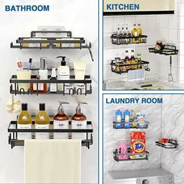 Show moreWelcome to a new era of neatness in your bathroom and kitchen with the **SIXDOVE 3-Pack Shower Caddy**. This meticulously designed stainless steel organizer shuns rust and corrosion, ensuring longevity even in the most humid environments. It features a sleek matte black finish that not only provides a contemporary touch but also blends seamlessly with any decor. Each caddy is equipped with a towel bar and 16 hooks for ultimate versatility, allowing you to hang towels, loofahs, and other essentials within reach. Say goodbye to cluttered surfaces and hello to an organized and stylish space!