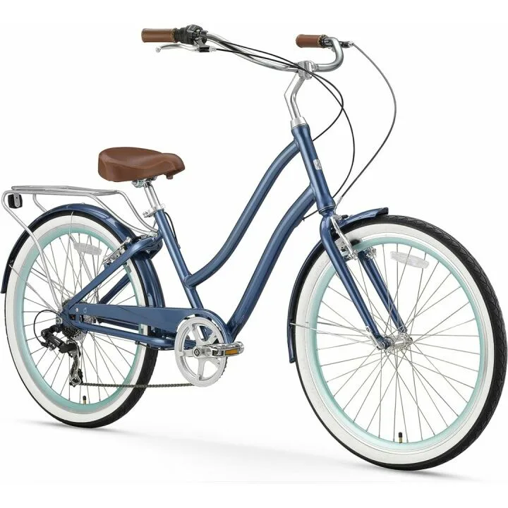 Show moreIntroducing the sixthreezero EVRYjourney Women's Beach Cruiser Bike – a perfect blend of style, comfort, and functionality. This step-through touring hybrid bicycle is designed for those who appreciate the simplicity of a beach cruiser but want the versatility of a hybrid bike. The EVRYjourney bike's unique design allows for an upright riding position, relieving pressure on your back and shoulders, making every ride a pleasure. Available in chic colors like mint green and blue sparkly, this bicycle exudes a retro charm that is sure to turn heads. The sturdy construction ensures durability while remaining lightweight enough for easy maneuverability. With its smooth 7-speed gear system, you'll find it easy to tackle varying terrains without feeling overwhelmed. The comfortable seat and wide handlebars add to the overall comfort, making it an ideal choice for both casual rides around town and longer journeys. Whether you are commuting, running errands, or simply taking a leisurely ride, the sixthreezero EVRYjourney provides a smooth, enjoyable experience.