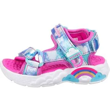 Show moreIntroducing the ultimate blend of comfort, style, and fun—the Skechers Kids' Girls Sport Lighted Sneakers, designed to light up every moment for your little superstar! These captivating shoes feature an Air-Cooled Memory Foam(R) cushioned comfort insole that ensures each tiny step is a delight. The stunning light-up midsole, adorned with a delightful cloud and rainbow design, is guaranteed to mesmerize kids and adults alike. Made from breathable athletic mesh with a synthetic upper and a touch of glitter trim, these shoes strike the perfect balance between playful and fashionable.
