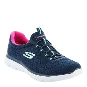 Show moreIntroducing the Skechers Women's Summits Sneaker in Navy/Hot Pink, a pinnacle of style, comfort, and everyday functionality. Crafted with a soft flat mesh knit upper that effortlessly combines style and breathability, these sneakers are perfect for any casual or athletic outing. The standout feature is the Memory Foam cushioned comfort insole, ensuring that each step you take is met with delightful comfort and support. The lightweight flexible shock-absorbing midsole allows you to move freely without feeling weighed down, making them ideal for all-day wear.