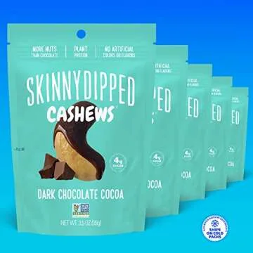 SkinnyDipped Dark Chocolate Cocoa Cashews, Healthy Snack, Plant Protein, Gluten Free, 3.5 oz Resealable Bags, Pack of 5