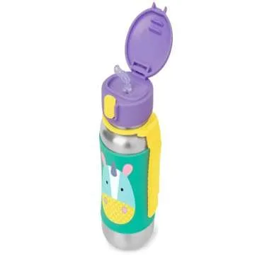 Our kids stainless steel water bottle has a no-slip silicone sleeve to protect little hands from cold surfaces. It has a handy grab-me strap that attaches to anything, along with a pop-up lid so the flexible straw stays clean