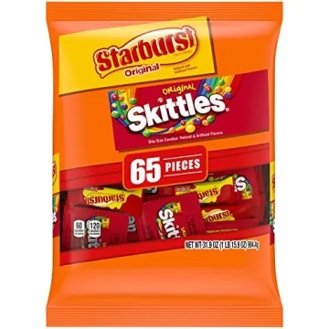 Show moreIndulge in the joy of sharing with the Fun Size SKITTLES & STARBURST Candy Variety Mix! This delightful assortment brings together everyone's favorite fruity treats into one convenient 31.9-ounce bag, containing 65 pieces of pure bliss. Each bag is packed with the iconic SKITTLES Original Candy and STARBURST Original Candy, designed to cater to the sweet cravings of all candy lovers.