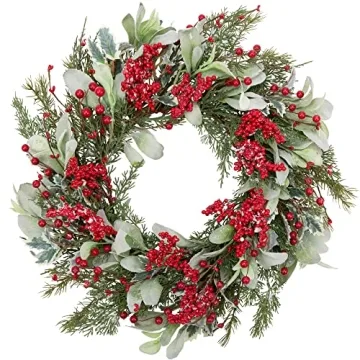 The wreath is crafted from high-quality artificial materials, including lambs ear leaves, artificial snow, red berries, and pine needles, ensuring a vibrant and long-lasting appearance.