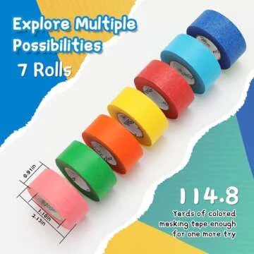 Show more Introducing the ultimate creative companion for art enthusiasts, teachers, and busy parents—our vibrant 7-Roll Colored Masking Tape Set. Each roll measures a generous 1 inch wide by 16.4 yards long, providing a value pack that ensures you won't run out any time soon! Whether you're embellishing a craft, organizing supplies, or implementing fun projects, this colored tape is designed to meet your every need. With a striking range of colors—from fiery reds and sunny yellows to calming blues—it's the perfect palette to inspire your creativity.