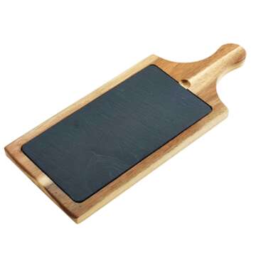 Acacia’s tight pores shrug off moisture, and a periodic coat of food-grade mineral oil keeps the wood hydrated and warp-free. The removable slate lifts out for rinsing; mild soap and a soft sponge dislodge cheese oils without damaging the stone’s surface texture. When fully dry, a drop of mineral oil revives slate’s deep charcoal tone and seals micro-fissures for long life.