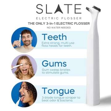Show more The Slate Power Flosser is not just an ordinary dental tool; it is a revolution in oral hygiene. With its unique 3-in-1 design, this innovative flosser not only effectively flosses your teeth but also massages your gums and cleans your tongue. Say goodbye to traditional flossing methods that are often time-consuming and difficult to navigate. The Slate Power Flosser makes oral care enjoyable and effortless.