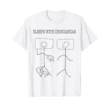 When compared to other dog-themed apparel, our "SLEEPS WITH CHIHUAHUAS" T-shirt stands out due to its combination of comfort, durability, and charming design. Many competing brands use heavier materials that can be uncomfortable, especially in warmer climates, whereas our lightweight fabric ensures a pleasant fit all day long. Moreover, the unique stick figure graphic adds a playful touch not often found in standard pet T-shirts.