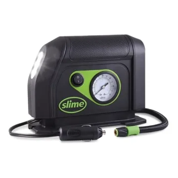 Show more Meet the Slime 40050 Tire Inflator, your ultimate roadside companion, engineered to tackle all your inflation needs with ease. This compact, powerful air compressor plugs effortlessly into any standard 12-volt car accessory outlet, making it an indispensable tool for those unexpected times when your tires need a boost. Whether you're on a scenic road trip or just commuting to work, this tire inflator ensures you will always have peace of mind regarding tire pressure. It's easy to use: just push a button and watch as this sophisticated device fills your tires to the desired level. In fact, it achieves an impressive 8-minute inflation time from flat to full for standard tires, taking the hassle out of roadside repairs.