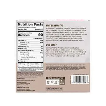 Show more Introducing the SlimFast Keto Fat Bomb Snack Cups, your ultimate companion for guilt-free indulgence during your keto journey! Each snack cup is a delightful blend of 8g of healthy fat designed to keep you full and satisfied without compromising your dietary goals. With rich layers of decadent chocolate and refreshing mint filling, these convenient cups offer the perfect solution for sugar cravings without the carbohydrates. Perfectly crafted for ketogenic and low-carb dieters, they come with just 1g of net carbs and 0g of sugar, ensuring your snack is free from unwanted sugars and carbs.