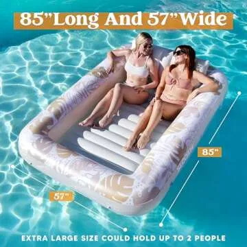Show more Meet the Sloosh Inflatable Tanning Pool Lounger Float – your ultimate companion for basking in the sun and enjoying refreshing relaxation! Measuring an impressive 85 inches long and 57 inches wide, this extra-large inflatable tanning pool provides ample space for up to two adults to lay back and soak up the rays comfortably. Crafted from premium, thick, heavy-duty UV resistant PVC, it's designed to withstand the summer sun while offering exceptional durability. Its 0.3mm thickness ensures no leaks or punctures, allowing you to float worry-free all season long.