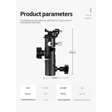 Introducing the ultimate solution for photographers: the versatile Flash Umbrella Holder. Crafted by industry-leading specialists, this innovative lamp holder enables you to apply it to various speedlights and flash setups. Its 180-degree swivel joint allows for seamless adjustment, making it easy to position your flash exactly where you need it for that perfect shot, whether you're using a reflective umbrella or a soft light umbrella. This holder is not just functional;...