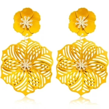 Show more Indulge in the exquisite beauty of our Elegant Flower Earrings, a perfect blend of Bohemian and Hawaiian inspirations. These stunning floral dangle earrings feature two meticulously crafted graduated bloom flowers, finished in a soft matte texture, accented by a radiant gold-tone stamen in the center. They are designed to effortlessly enhance your outfits, ensuring you turn heads and garner compliments wherever you go. Measuring approximately 70mm in length and 40mm in width, each earring weighs just 0.2oz, guaranteeing comfort without compromising style.
