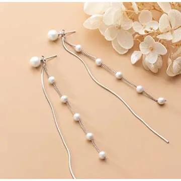 SLUYNZ Solid 925 Sterling Silver Simulated Shell Pearl Dangle Earrings Chain for Women Teen Girls Elegant Long Dangle Earrings Tassel Wedding Dangle Earrings (A-Sterling Silver)