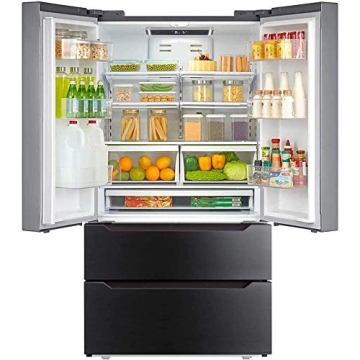 Show more Introducing the ultimate solution to your kitchen storage needs: a French Door Refrigerator that boasts an impressive capacity of 22.5 Cu. Ft.. With its sleek and modern design featuring fingerprint-proof black stainless steel doors, this refrigerator effortlessly combines style with functionality. The innovative digital temperature control panel allows for precise adjustments to ensure your perishables remain fresh longer.