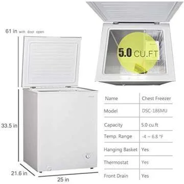 Show moreIntroducing the Smad Deep Chest Freezer, designed specifically for those who appreciate efficiency without compromising on style. With a generous capacity of 5 cu.ft, this chest freezer is perfect for families of 3 to 5 persons seeking a reliable solution for their frozen food storage. Measuring 25’’L x 21.6’’W x 33.5’’H, it fits seamlessly into your home while providing ample space for all your frozen essentials.
