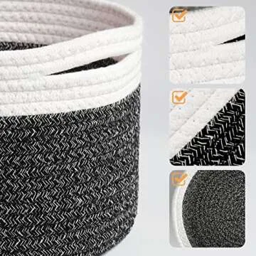 Small Rope Basket small Round Woven Basket With Handle 9.5x9.5x7.1 in Cute Cotton Basket Nursery Shelf Small Storage Basket Stitching Black Beige Mixed Design Style 8.2L…