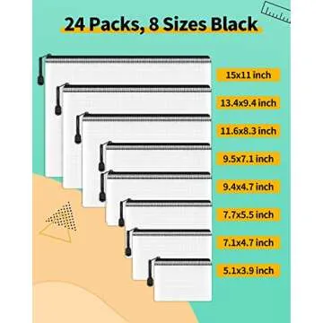 Smarpau Mesh Zipper Pouch, 24 Pack 8 Sizes Plastic Zipper Pouches for Organizing, Multipurpose Waterproof Zipper Bags for Travel, Office, Home Storage, Black