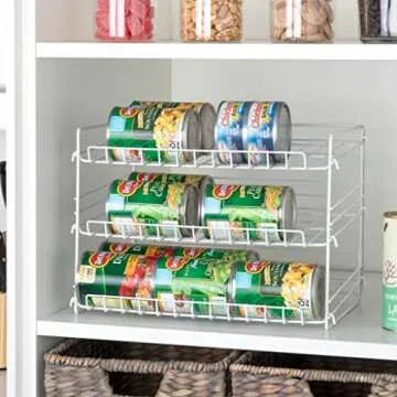 Show more If you are tired of rummaging through a cluttered pantry or cabinet in search of your favorite canned goods, look no further than the Smart Designs 3 Tier Can Rack Organizer. This innovative storage solution is designed to seamlessly fit into any pantry, food storage space, or shelving unit while ensuring that your canned goods are always within easy reach. With a unique gravity-fed design, this rack organizer maximizes your storage potential and keeps your cans neatly lined up and readily visible.